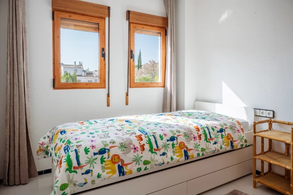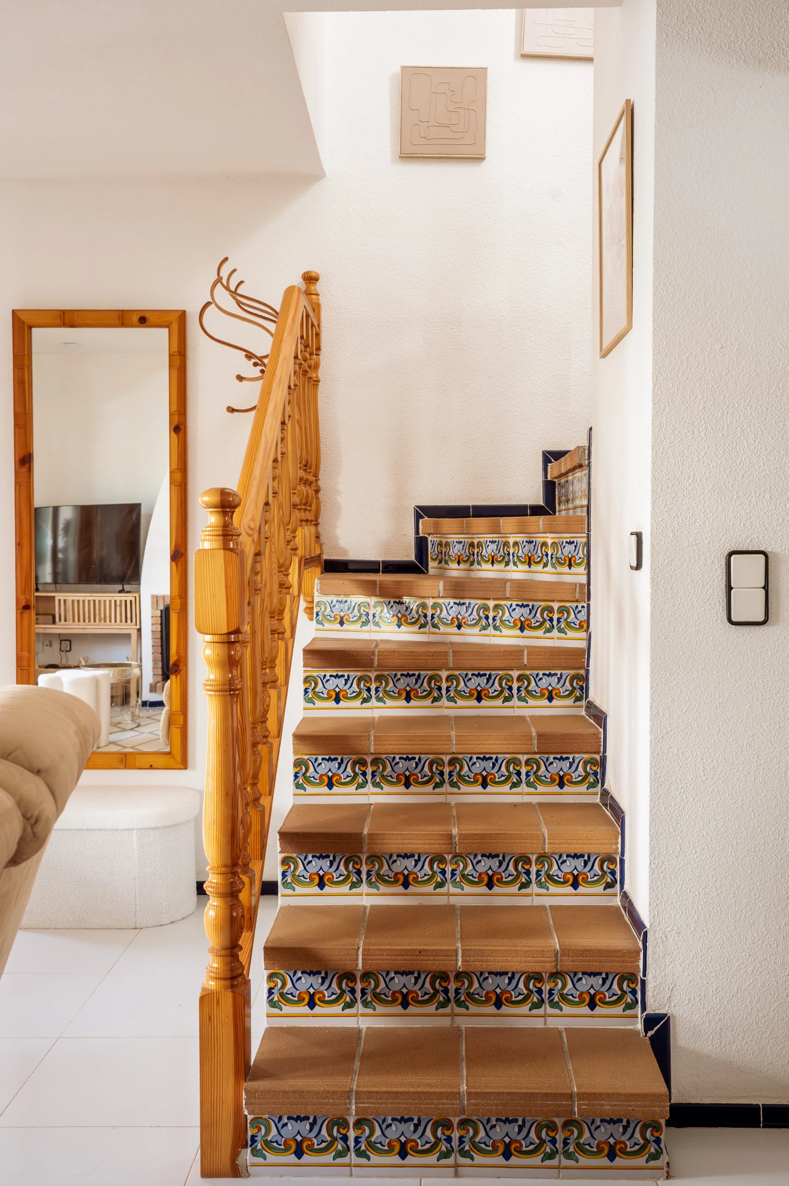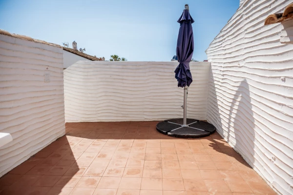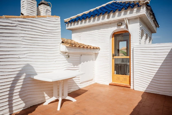 Het ruime dakterras is de ideale plek om in alle rust van de Spaanse zon te genieten – de hele dag door. Of je nu wilt zonnebaden, borrelen of ’s avonds genieten van het uitzicht, hier zit je altijd goed. In de afgesloten ruimte op het terras vind je een extra koelkast, barkrukken en een tafeltje: perfect voor een verfrissend drankje binnen handbereik. Een heerlijke plek om je vakantiedag ontspannen af te sluiten.